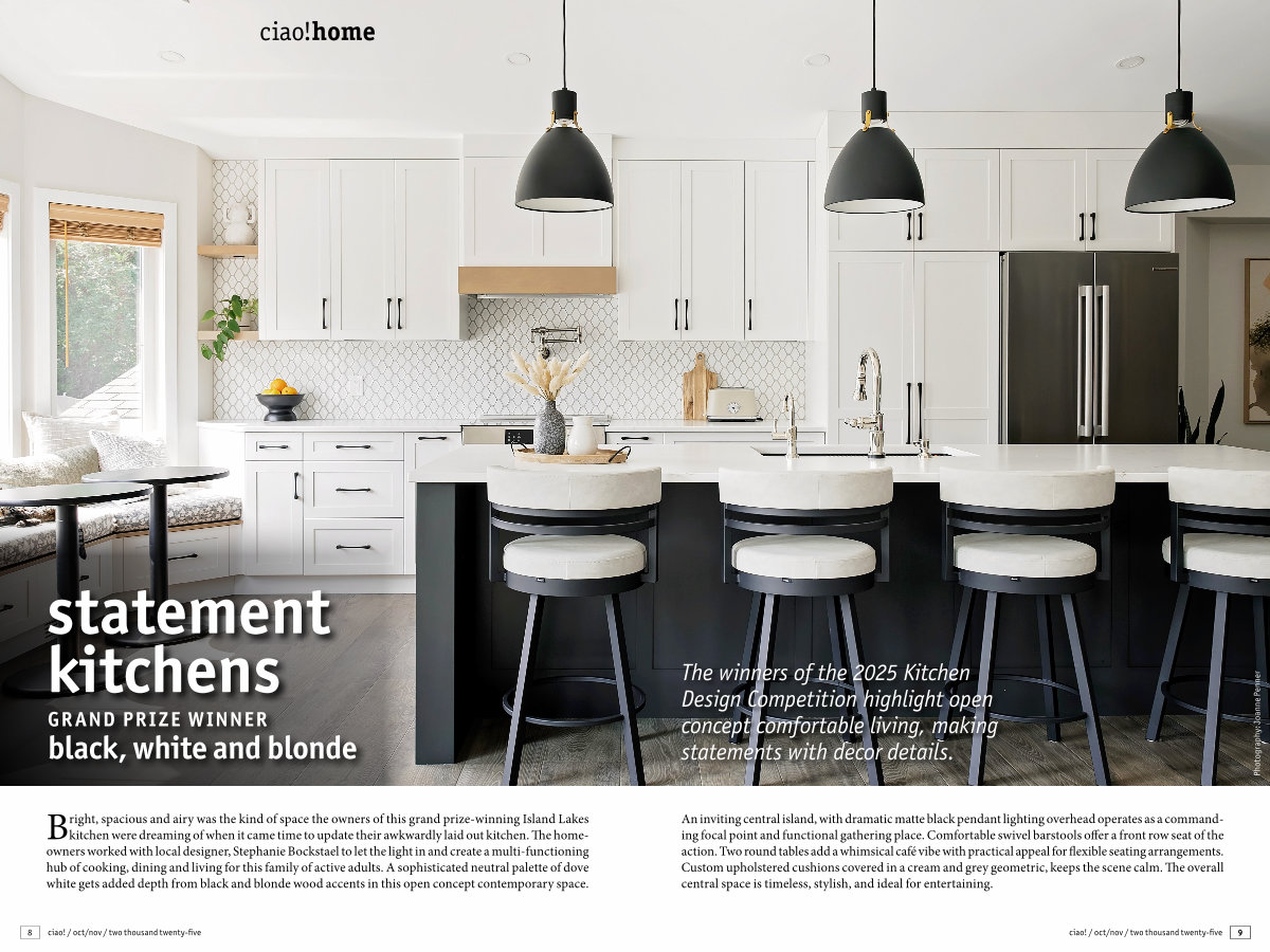 An inviting central island, with dramatic matte black pendant lighting overhead operates as a commanding focal point and functional gathering place. Comfortable swivel barstools offer a front row seat of the action. Two round tables add a whimsical café vibe with practical appeal for flexible seating arrangements. Custom upholstered cushions covered in a cream and grey geometric, keeps the scene calm. The overall central space is timeless, stylish, and ideal for entertaining. ciao! / oct / nov / two thousand twenty-five 9