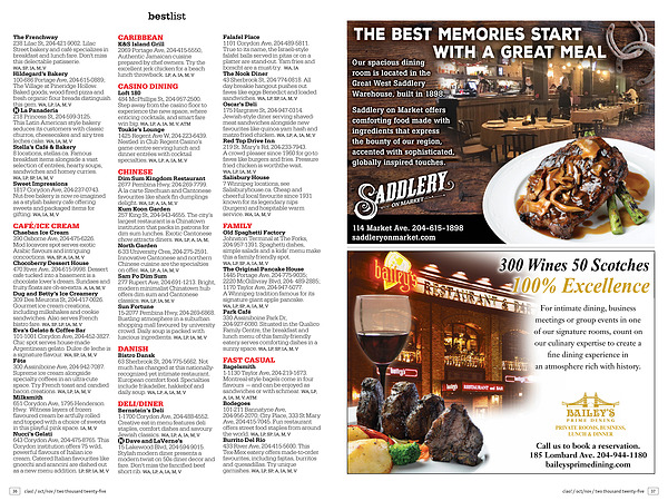Falafel Place 1101 Corydon Ave, 204-489‐5811. True to its name, the Israeli-style falafel balls served in pitas or on a platter are stand-out. Yam fries and borscht are a must-try. WA, IA The Nook Diner 43 Sherbrook St, 204‐774‐0818. All day breakie hangout pushes out faves like eggs Benedict and loaded sandwiches. WA, LP, SP, IA, M, V Oscar’ s Deli 175 Hargrave St, 204‐947-0314. Jewish-style diner serving shavedmeat sandwiches alongside new favourites like quinoa yam hash and matzo fried chicken. WA, LP, A, IA, M, V Red Top Drive Inn 219 St. Mary’ s Rd, 204-233-7943. A crowd pleaser since 1960 for go-to faves like burgers and fries. Pressure fried chicken is worththe wait.
