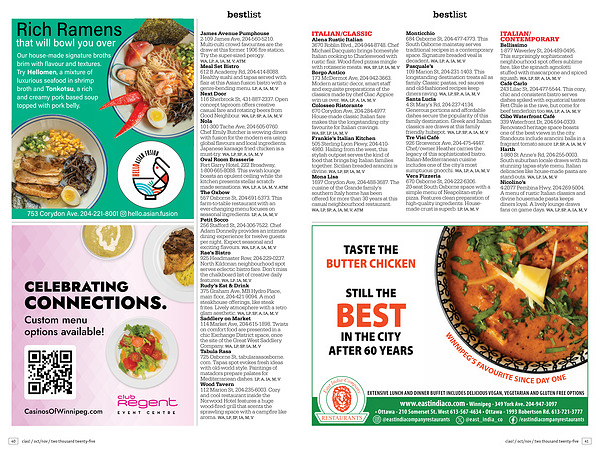 Meal Set Bistro 612 B Academy Rd, 204‐414‐8088. Healthy sushi and tapas served with flair at this Asian-fusion bistro with a genre-bending menu. LP, A, IA, M, V Next Door 116 Sherbrook St, 431-887-2337. Open concept taproom offers creative casual fare and rotating beers from Good Neighbour. WA, LP, SP, A, IA, M, V Nola 101-300 Tache Ave, 204-505-0760. Chef Emily Butcher is wowing diners with fusion for the modern era using global flavours and local ingredients. Japanese karaage fried chicken is a must-try. WA, LP, SP, A, IA, M, V Oval Room Brasserie Fort Garry Hotel, 222 Broadway, 1-800-665-8088. This swish lounge boasts an opulent ceiling while the kitchen presents stellar scratchmade sensations. WA, LP, A, IA, M, V, ATM The Oxbow 557 Osborne St, 204-691-5373. This farm-to-table restaurant with an ever-changing menu focuses on seasonal ingredients. LP, A, IA, M, V Petit Socco 256 Stafford St, 204-306-7522. Chef Adam Donnelly provides an intimate dining experience for twelve guests per night. Expect seasonal and exciting flavours. WA, LP, A, IA, M, V Rae’ s Bistro 925 Headmaster Row, 204-229-0237. North Kildonan neighbourhood spot serves eclectic bistro fare. Don’ t miss the chalkboard list of creative daily features. WA, LP, IA, M, V Rudy’ s Eat & Drink 375 Graham Ave, MB Hydro Place, main floor, 204-421-9094. A mod steakhouse offerings, like steak frites. Lively atmosphere with a retro glam aesthetic. WA, LP, SP, A, IA, M, V Saddlery on Market 114 Market Ave, 204‐615‐1898. Twists on comfort food are presented in a chic Exchange District space, once the site of the Great West Saddlery Company. WA, LP, SP, IA, M, V Tabula Rasa 725 Osborne St, tabularasaosborne. com. Tapas spot evokes fresh ideas with old-world style. Paintings of matadors prepare palates for Mediterranean dishes. LP, A, IA, M, V Wood Tavern 112 Marion St, 204-235-6003. Cozy and cool restaurant inside the Norwood Hotel features a huge wood-fired grill that scents the sprawling space with a campfire like aroma. WA, LP, SP, IA, M, V