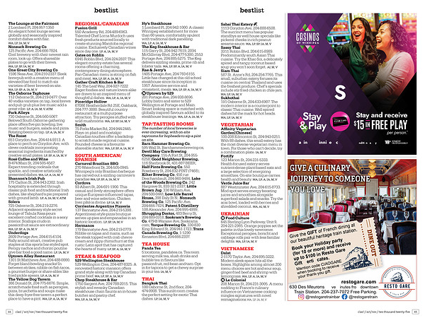 Affinity Vegetarian Garden [ Chinese ] 100‐208 Edmonton St, 204-943‐0251. With 88 dishes, this small eatery has the most diverse vegetarian menu in town. For those who can’ t decide, try a combination plate. IA, M, V Fortify 123 Marion St, 204-231-5333. Health-focused eatery serves nutrient-dense plant-based eats and a large selection of energizing smoothies. On-site boutique carries health and beauty. WA, LP, A, IA, M, V Verde Juice Bar 887 Westminster Ave, 204-615-8733. Mod spot serves energy boosting juices and smoothies alongside superfood salads and snacks. Try the acai bowl, loaded with berries and shredded coconut. WA, AI, M, V