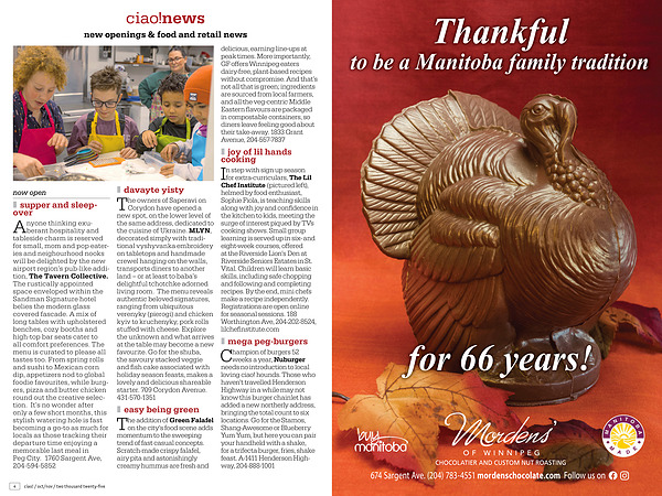 Anyone thinking exuberant hospitality and tableside charm is reserved for small, mom and pop eateries and neighourhood nooks will be delighted by the new airport region’ s pub-like addition, The Tavern Collective. The rustically appointed space enveloped within the Sandman Signature hotel belies the modern glass covered fascade. A mix of long tables with upholstered benches, cozy booths and high-top bar seats cater to all comfort preferences. The menu is curated to please all tastes too. From spring rolls and sushi to Mexican corn dip, appetizers nod to global foodie favourites, while burgers, pizza and butter chicken round out the creative selection. It’ s no wonder after only a few short months, this stylish watering hole is fast becoming a go-to as much for locals as those tracking their departure time enjoying a memorable last meal in Peg City. 1760 Sargent Ave, 204-594-5852 ciao! news new openings & food and retail news