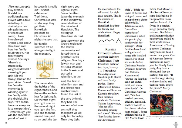 father, Ded Moroz is like Santa Clause, or some kids believe in Snegurochka Snow maiden. Instead of a flying in a magical sleigh pulled by flying reindeer, Ded Moroz and Snegurochka ride in a carriage pulled by three white horses. Also instead of having a tree on Christmas many families have a tree on new years. One of Katerinas favorite memories is every year her family has a party, they have a pinata,and they go skating. She says, “It is so fun to go skating with my family, and that she really enjoys the pinata”. Merry Christmas!