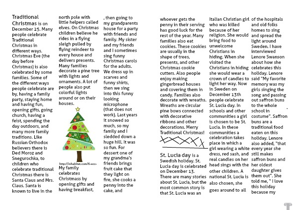 St. Lucia day is a Swedish holiday. St. Lucia day is celebrated on December 13. There are many stories about St. Lucia, but the most common story is that St. Lucia was an Italian Christian girl who was killed because of her religion. She would bring food to unwelcome Christians in hiding. When she visited the Christians in hiding she would wear a crown of candles to light her way. Now in Sweden on December 13th people celebrate St. Lucia day. In schools and other communities a girl is chosen to be St. Lucia. In these communities a celebration takes place in which a girl wearing a white dress, red sash, and real candles on her head sings with the other children. A national St. Lucia is also chosen, she goes around to all of the hospitals and old folks homes to sing and spread the light around Sweden. I have interviewed Lenore Swanson about how she celebrates this holiday. Lenore said “My favorite memory was my girls singing the song and passing out saffron buns to the whole school in costume”. Saffron buns are a traditional food eaten on this holiday. Lenore also added, “that every year she still makes saffron buns and her oldest daughter gives them out”. She told me, “ I love this holiday because my family is Swedish and it is our heritage. My own girls dressed up like her with the wreath and candles on their heads when they were little”. To Lenore St.lucia was a girl who helped and saved many people. “She brought light, heat, and food to sweden during hard times”, said Lenore. Happy St. Lucia day!