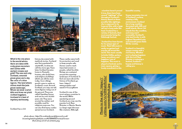 scientists haven't proved it true, there have been several “sightings” of her throughout Scotland's history. Based on these possibly fake sightings, she is supposed to be long and thin, with a large tail and a long snake like head. Scotland has a variety of festivals, their most popular being the Edinburgh festival.