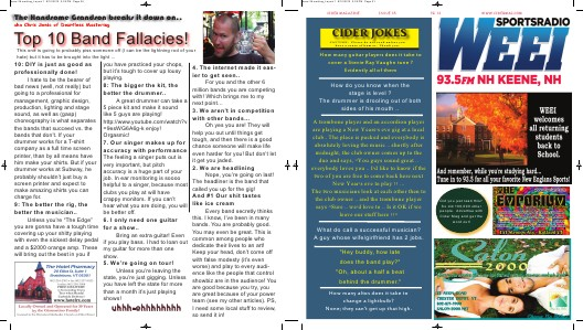 For you and the other 6 million bands you are competing with! Which brings me to my A great drummer can take a next point… 5 piece kit and make it sound 3. We aren’t in competition like 5 guys are playing! with other bands... http://www.youtube.com/watch?v Oh yes you are! They will =9esWG6A6g-k enjoy! help you out until things get Orgasmic! 7. Our singer makes up for tough, and then there is a good chance someone will make life accuracy with performance even harder for you! But don’t let The feeling a singer puts out is it get you jaded. very important, but pitch 2. We are headlining accuracy is a huge part of your Nope, you’re going on last! job. In ear monitoring is soooo The headliner is the band that helpful to a singer, because most called you up for the gig! clubs you play at will have And #1 Our shit tastes crappy monitors. If you can’t 9