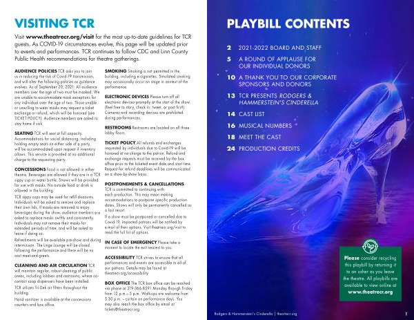 Visit www . theatrecr . org / visit for the most up-to-date guidelines for TCR guests . As COVID-19 circumstances evolve , this page will be updated prior to events and performances . TCR continues to follow CDC and Linn County Public Health recommendations for theatre gatherings .