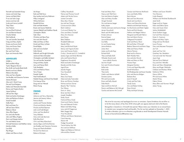 ADVOCATE $ 350 + Beth and Bob Allsop Taylor Skogman-Barron Ray Smith and Lynda Black-Smith Beverly and Larry Blades Rebecca Boscaljon Alan and Terry Boyden Jan Bradley and Giacomo Tormene Jeremy Brimeyer Alex and J . David Carey Pat and Carol Deignan Stefan and Wannette Doerrfeld Denny and Virginia Durbin James Eichhorn Jeff and Terri Elgin Mark and LeAnn Erenberger Alan and Barbara Erickson Sarah Fersdahl Molly Flynn Rick and Greer Fry Jeff and Jane Glantz Rebecca Glover Mary Ellen Rogers Eric and Julie Hender John and Hillary Hughes Kevin and Margie Jenkins Tim and Melissa Jones Michael Kammerer and Matthew James Marilynn Keller Lisa Kelly Flip Klinger Aileen and Sherwin Koch