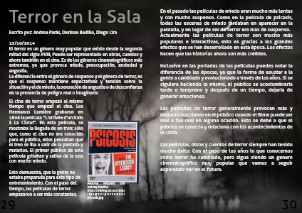 El terror es un género muy popular que existe desde la segunda mitad del siglo XVIII, Puede ser representado en obras, cuentos y ahora también en el cine. Es de los géneros cinematográficos más extremos, ya que provoca miedo, preocupación, ansiedad y angustia.
