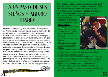 El cine es la técnica y arte de proyectar fotogramas de forma rápida y sucesiva para crear la impresión de movimiento, mostrando algún vídeo. Para poder formar estos videos o películas se necesita una previa planeación, es decir crear un guion para saber en qué momento se acomodaran los sucesos, de qué tratara la historia del video o película, etc. La persona que se encarga de crear este guion es llamada guionista. El guionista se encarga de desarrollar la historia, de crear los personajes, y darle una cronología a los sucesos, tiene un rol importante en la filmación de la película como lo tiene un director de cine, es por eso que hemos decidido entrevistar a un estudiante que se prepara para ser un guionista y director de cine. Él es Arturo Juárez, tiene 18 años y comenzará a perseguir su sueño de ser director de cine en muy poco tiempo.
