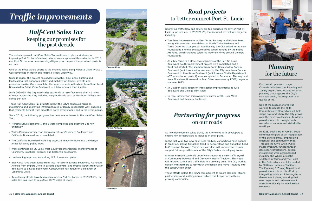 • As 2025 came to a close, two segments of the Port St. Lucie Boulevard South Improvement Project were completed and a third had started. The segment from Gatlin Boulevard to Darwin Boulevard( which was being overseen by the City) and from Darwin Boulevard to Alcantarra Boulevard( which was a Florida Department of Transportation project) were completed in December. The segment from Alcantarra Boulevard to Paar Drive, overseen by FDOT, began in summer 2025.