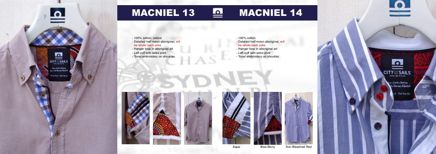 - 100 % cotton, oxford- Detailed half moon aboriginal, will be whole back yoke- Hanger loop in aboriginal art- Left cuff with extra print- Tonal embroidery on shoulder