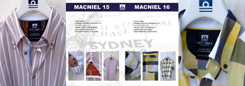 - Linnen fabric- Detailed half moon aboriginal, will be whole back yoke- Hanger loop in aboriginal art- Left cuff with extra print- Tonal embroidery on shoulder