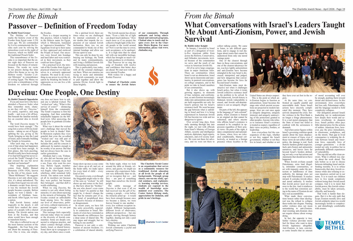 The subtle message of Dayeinu is that even if all we had received was the gift of becoming a people – even before the miracles piled up – it would have been enough because once we became a nation, we were forever bound to one another – every Jew without exception included. Different backgrounds, different levels of observance, different perspectives – but one people, moving through history together, sharing not only a past but a destiny. Chag Sameach. Wishing our entire Charlotte Jewish community a joyful and unifying Passover.