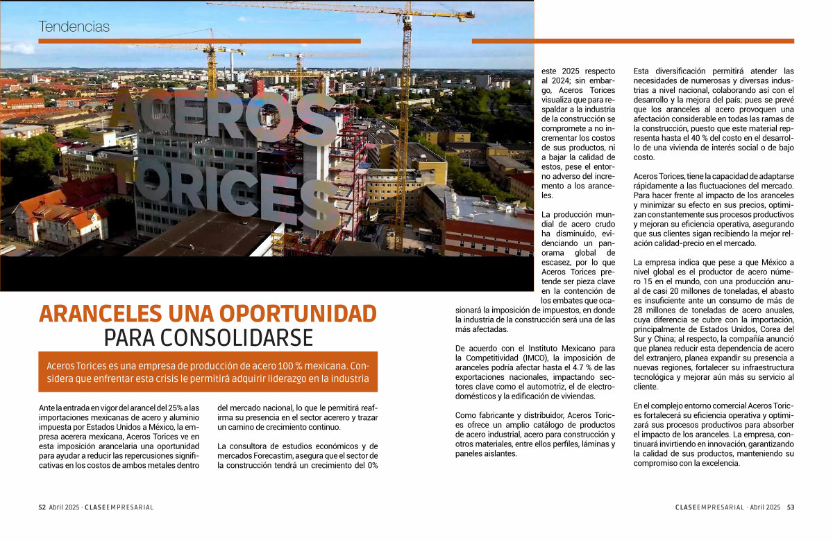 Ante la entrada en vigor del arancel del 25 % a las importaciones mexicanas de acero y aluminio impuesta por Estados Unidos a México, la empresa acerera mexicana, Aceros Torices ve en esta imposición arancelaria una oportunidad para ayudar a reducir las repercusiones significativas en los costos de ambos metales dentro del mercado nacional, lo que le permitirá reafirma su presencia en el sector acerero y trazar un camino de crecimiento continuo.