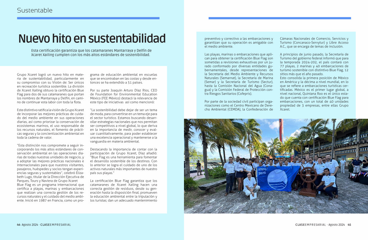 Grupo Xcaret logró un nuevo hito en materia de sustentabilidad , particularmente en su compromiso con su Visión de : Ser únicos en recreación turística sostenible . La división de Xcaret Xailing obtuvo la certificación Blue Flag para dos de sus catamaranes que portan los nombres de Mantarraya y Delfín , en camino de continuar esta labor con toda la flota .
