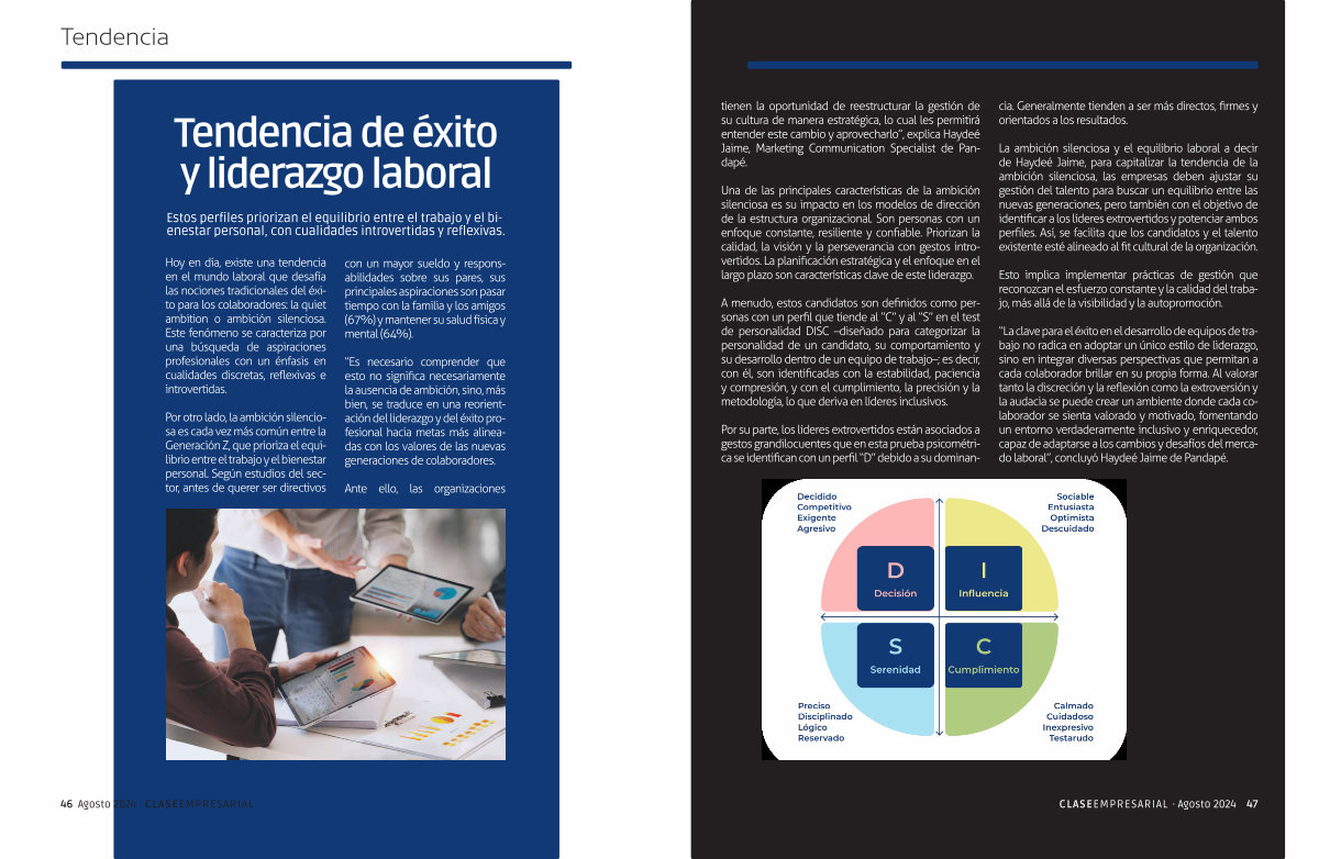 “ La clave para el éxito en el desarrollo de equipos de trabajo no radica en adoptar un único estilo de liderazgo , sino en integrar diversas perspectivas que permitan a cada colaborador brillar en su propia forma . Al valorar tanto la discreción y la reflexión como la extroversión y la audacia se puede crear un ambiente donde cada colaborador se sienta valorado y motivado , fomentando un entorno verdaderamente inclusivo y enriquecedor , capaz de adaptarse a los cambios y desafíos del mercado laboral ”, concluyó Haydeé Jaime de Pandapé .
