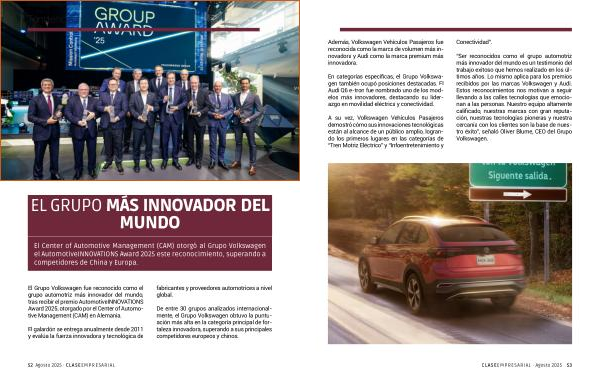 El Grupo Volkswagen fue reconocido como el grupo automotriz más innovador del mundo, tras recibir el premio AutomotiveINNOVATIONS Award 2025, otorgado por el Center of Automotive Management( CAM) en Alemania.