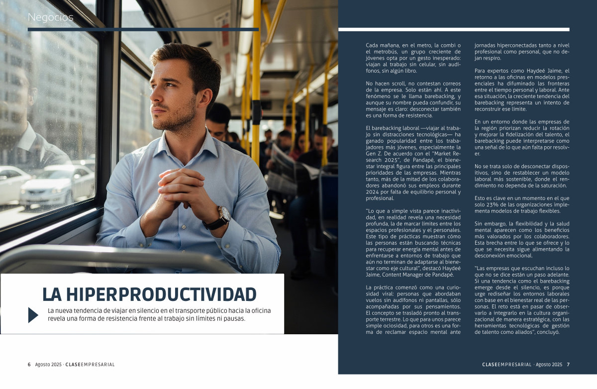 El barebacking laboral— viajar al trabajo sin distracciones tecnológicas— ha ganado popularidad entre los trabajadores más jóvenes, especialmente la Gen Z. De acuerdo con el“ Market Research 2025”, de Pandapé, el bienestar integral figura entre las principales prioridades de las empresas. Mientras tanto, más de la mitad de los colaboradores abandonó sus empleos durante 2024 por falta de equilibrio personal y profesional.