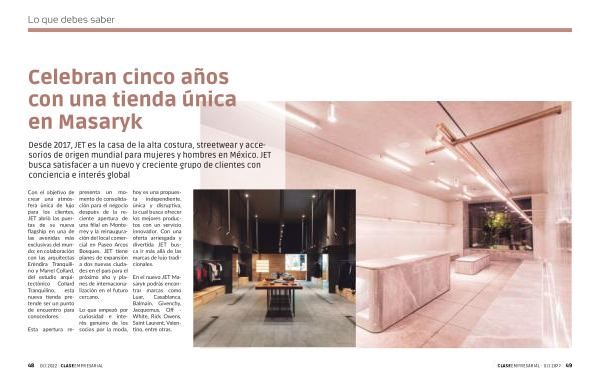 Con el objetivo de crear una atmósfera única de lujo para los clientes , JET abrió las puertas de su nueva flagship en una de las avenidas más exclusivas del mundo ; en colaboración con las arquitectas Eréndira Tranquilino y Mariel Collard , del estudio arquitectónico Collard Tranquilino , esta nueva tienda pretende ser un punto de encuentro para conocedores .