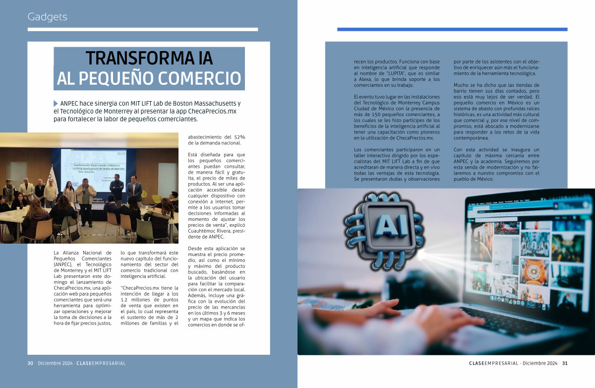 La Alianza Nacional de Pequeños Comerciantes ( ANPEC ), el Tecnológico de Monterrey y el MIT LIFT Lab presentaron este domingo el lanzamiento de ChecaPrecios . mx , una aplicación web para pequeños comerciantes que será una herramienta para optimizar operaciones y mejorar la toma de decisiones a la hora de fijar precios justos , lo que transformará este nuevo capítulo del funcionamiento del sector del comercio tradicional con inteligencia artificial .