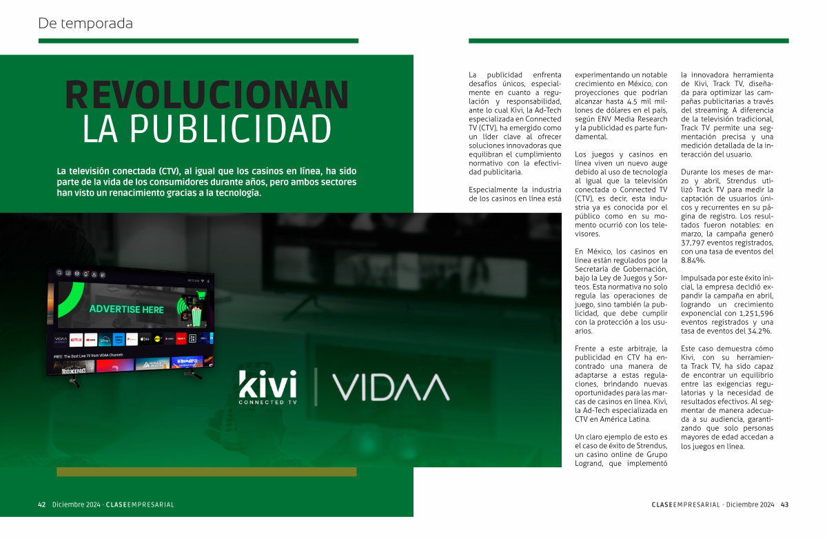 La publicidad enfrenta desafíos únicos , especialmente en cuanto a regulación y responsabilidad , ante lo cual Kivi , la Ad-Tech especializada en Connected TV ( CTV ), ha emergido como un líder clave al ofrecer soluciones innovadoras que equilibran el cumplimiento normativo con la efectividad publicitaria .