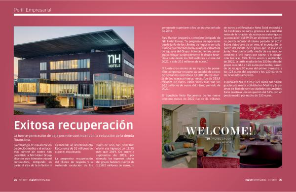 La progresiva recuperación del cliente de negocio y la sostenida evolución de los viajes de ocio han permitido elevar sus ingresos un 18,3 % más que 2019 . De enero a septiembre de 2022 , por ejemplo , los ingresos totales del grupo hotelero fueron de 1.258,3 millones de euros , li-