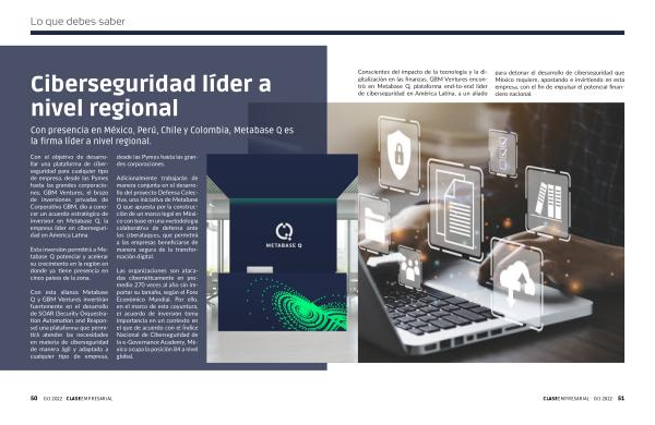 Conscientes del impacto de la tecnología y la digitalización en las finanzas , GBM Ventures encontró en Metabase Q , plataforma end-to-end líder de ciberseguridad en América Latina , a un aliado para detonar el desarrollo de ciberseguridad que México requiere , apostando e invirtiendo en esta empresa , con el fin de impulsar el potencial financiero nacional .