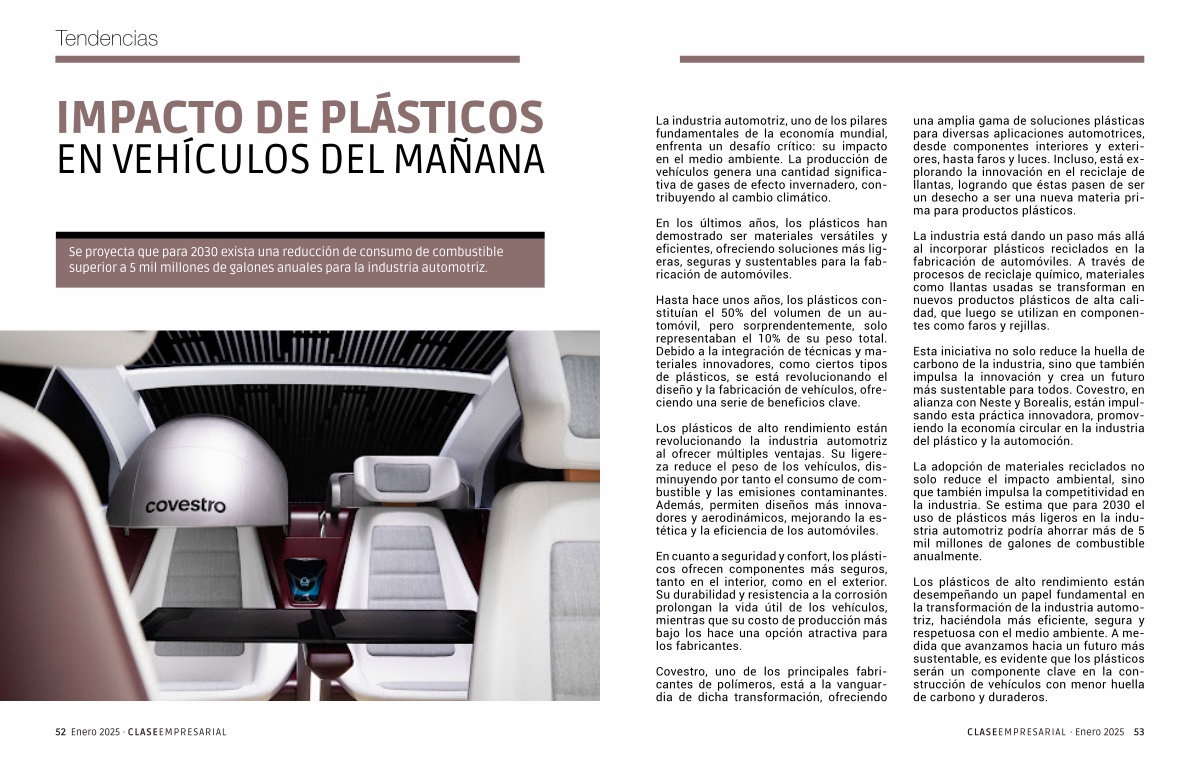 Covestro, uno de los principales fabricantes de polímeros, está a la vanguardia de dicha transformación, ofreciendo una amplia gama de soluciones plásticas para diversas aplicaciones automotrices, desde componentes interiores y exteriores, hasta faros y luces. Incluso, está explorando la innovación en el reciclaje de llantas, logrando que éstas pasen de ser un desecho a ser una nueva materia prima para productos plásticos.