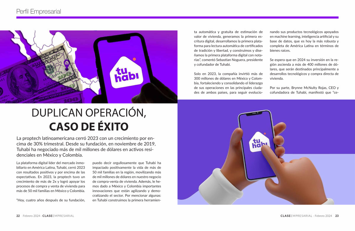 La plataforma digital líder del mercado inmobiliario en América Latina , Tuhabi , cerró 2023 con resultados positivos y por encima de las expectativas . En 2023 , la proptech tuvo un crecimiento de más de 2x y logró apoyar los procesos de compra y venta de vivienda para más de 50 mil familias en México y Colombia .