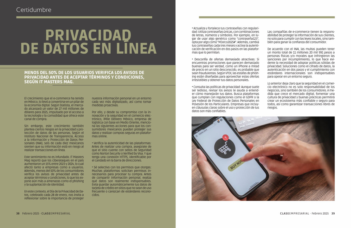 Sin embargo, este crecimiento también plantea ciertos riesgos en la privacidad y protección de datos de las personas. Según el Instituto Nacional de Transparencia, Acceso a la Información y Protección de Datos Personales( INAI), seis de cada diez mexicanos sienten que su información está en riesgo al realizar transacciones en línea.