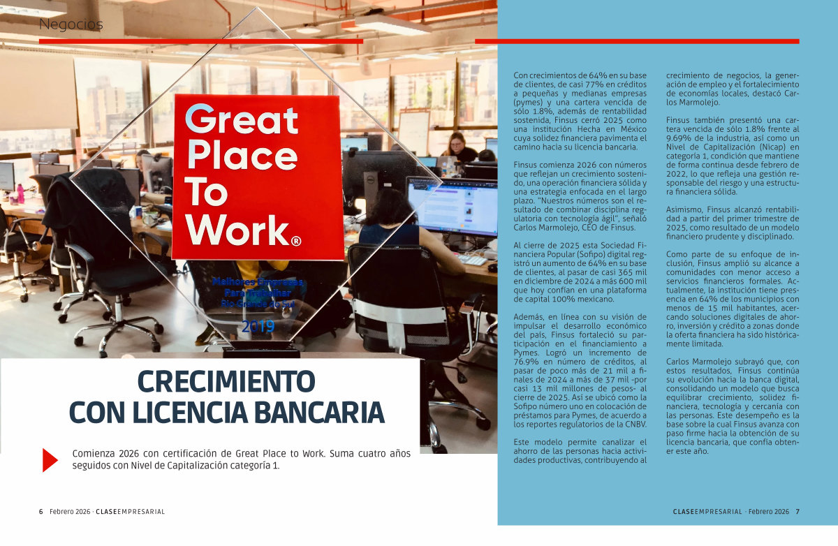 Con crecimientos de 64 % en su base de clientes, de casi 77 % en créditos a pequeñas y medianas empresas( pymes) y una cartera vencida de sólo 1.8 %, además de rentabilidad sostenida, Finsus cerró 2025 como una institución Hecha en México cuya solidez financiera pavimenta el camino hacia su licencia bancaria.