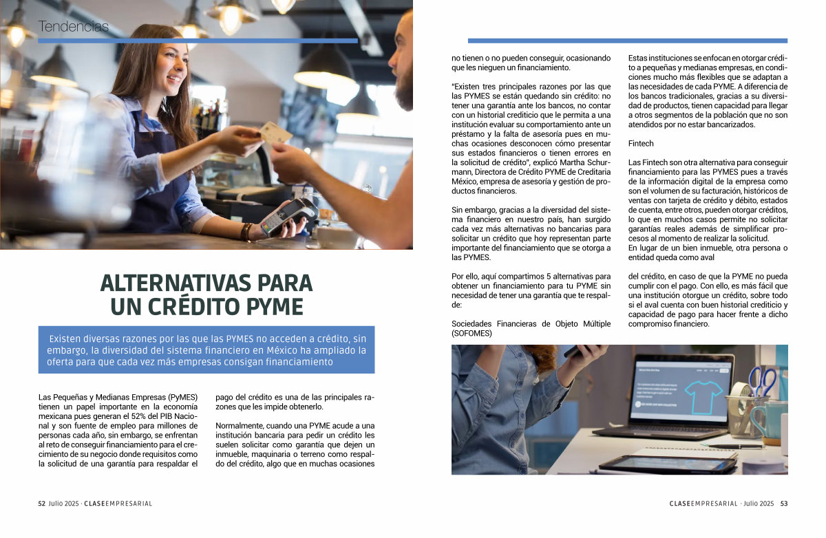 “ Existen tres principales razones por las que las PYMES se están quedando sin crédito: no tener una garantía ante los bancos, no contar con un historial crediticio que le permita a una institución evaluar su comportamiento ante un préstamo y la falta de asesoría pues en muchas ocasiones desconocen cómo presentar sus estados financieros o tienen errores en la solicitud de crédito”, explicó Martha Schurmann, Directora de Crédito PYME de Creditaria México, empresa de asesoría y gestión de productos financieros.