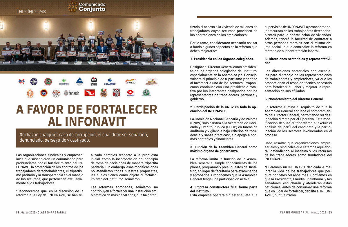 “ Queremos un INFONAVIT dedicado a mejorar la vida de los trabajadores que perdure por otros 50 años más. Confiamos en que la Presidenta, Claudia Sheinbaum, y los senadores, escucharán y atenderán estas peticiones, antes de consumar una reforma que en lugar de fortalecer, debilita al INFON- AVIT”, puntualizaron.