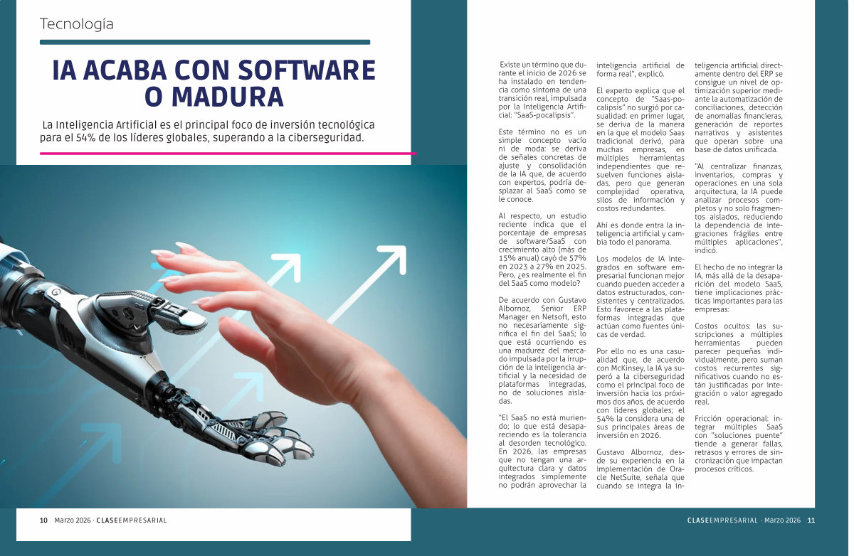 De acuerdo con Gustavo Albornoz, Senior ERP Manager en Netsoft, esto no necesariamente significa el fin del SaaS; lo que está ocurriendo es una madurez del mercado impulsada por la irrupción de la inteligencia artificial y la necesidad de plataformas integradas, no de soluciones aisladas.