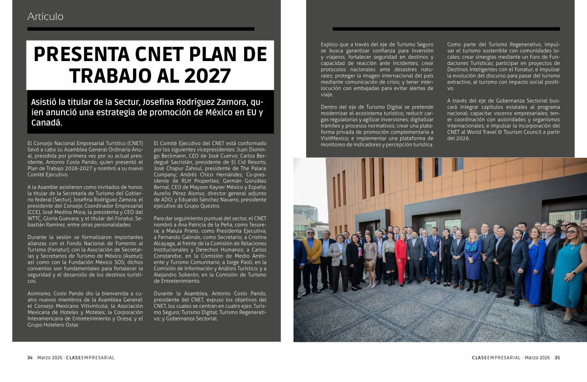 El Consejo Nacional Empresarial Turístico( CNET) llevó a cabo su Asamblea General Ordinaria Anual, presidida por primera vez por su actual presidente, Antonio Cosío Pando, quien presentó el Plan de Trabajo 2026-2027 y nombró a su nuevo Comité Ejecutivo.