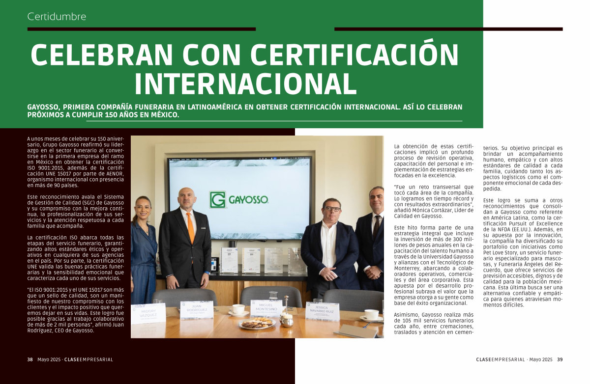 A unos meses de celebrar su 150 aniversario, Grupo Gayosso reafirmó su liderazgo en el sector funerario al convertirse en la primera empresa del ramo en México en obtener la certificación ISO 9001:2015, además de la certificación UNE 15017 por parte de AENOR, organismo internacional con presencia en más de 90 países.