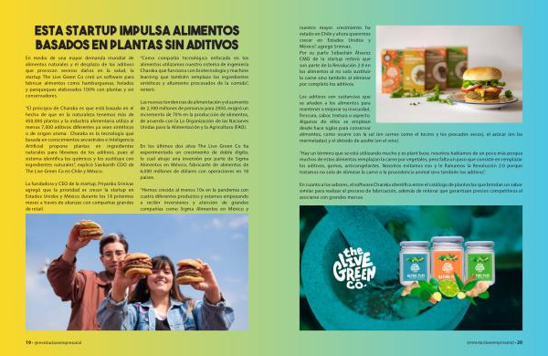 En medio de una mayor demanda mundial de alimentos naturales y el desplazo de los aditivos que provocan severos daños en la salud , la startup The Live Green Co creó un software para fabricar alimentos como hamburguesas , helados y panqueques elaborados 100 % con plantas y sin conservadores .