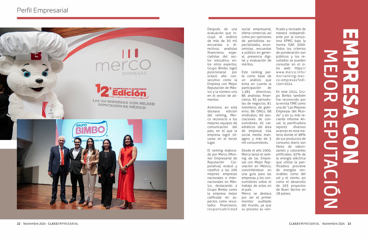 El ranking elaborado por Merco ( Monitor Empresarial de Reputación Corporativa ), evaluó y clasificó a las 200 mejores empresas nacionales e internacionales en México , destacando a Grupo Bimbo como la empresa mejor calificada en aspectos como resultados financieros , responsabilidad