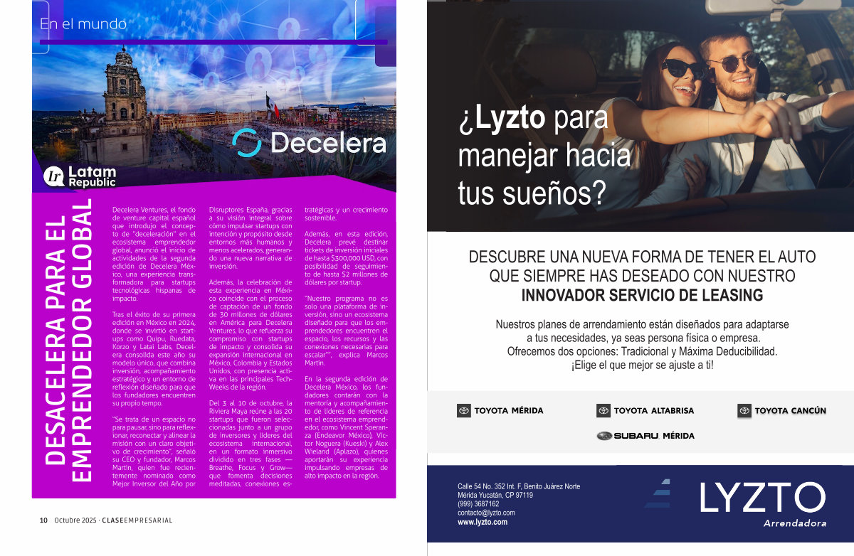 En la segunda edición de Decelera México, los fundadores contarán con la mentoría y acompañamiento de líderes de referencia en el ecosistema emprendedor, como Vincent Speranza( Endeavor México), Víctor Noguera( Kueski) y Alex Wieland( Aplazo), quienes aportarán su experiencia impulsando empresas de alto impacto en la región.