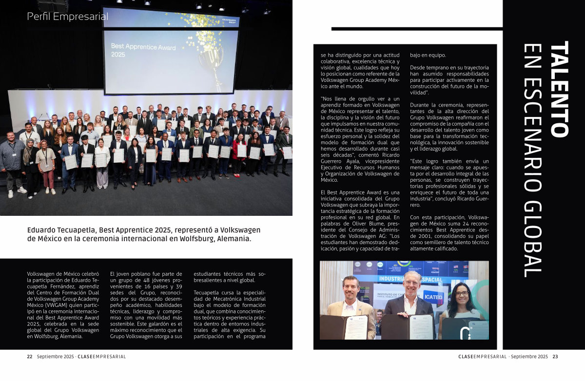 “ Nos llena de orgullo ver a un aprendiz formado en Volkswagen de México representar el talento, la disciplina y la visión del futuro que impulsamos en nuestra comunidad técnica. Este logro refleja su esfuerzo personal y la solidez del modelo de formación dual que hemos desarrollado durante casi seis décadas”, comentó Ricardo Guerrero Ayala, vicepresidente Ejecutivo de Recursos Humanos y Organización de Volkswagen de México.