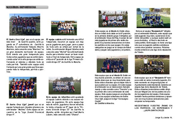 El Santa Cruz Ujaf, que es el equipo con más nivel de nuestro pueblo, está jugando en 1 ª autonómica de Castilla-la Mancha. Su entrenador llamado Alberto Montoro, más conocido como“ Montoro” es un gran elemento motivador de equipo. Está siendo una gran temporada para todos estos jugadores que se están mereciendo estar en lo alto porque se están esforzando al máximo y dándolo todo en cada partido. También este equipo está formado por una gran grada que lleva apoyando toda la temporada, partido a partido.