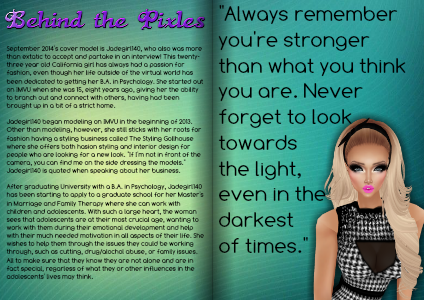 September 2014's cover model is Jadegirl140, who also was more than extatic to accept and partake in an interview! This twenty-three year old California girl has always had a passion for fashion, even though her life outside of the virtual world has been dedicated to getting her B.A. in Psychology. She started out on IMVU when she was 15, eight years ago, giving her the ability to branch out and connect with others, having had been brought up in a bit of a strict home.