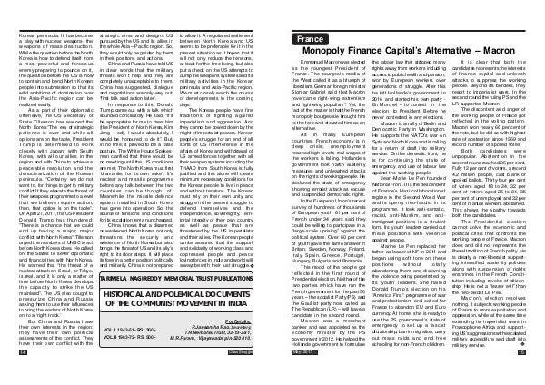Macron is an ally of Berlin and Democratic Party in Washington. He supports the NATO’ s war on Syria and North Korea and is calling for a return of draft into military service. On the domestic front, he is for continuing the state of emergency and use of labour law against the working people.