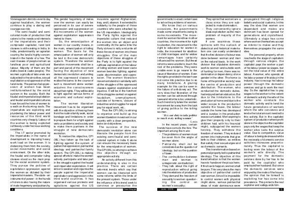 The success of the new democratic revolution alone can liberate the people from the existing semi-feudal and semicolonial system in India It alone can ensure the necessary basis for the emancipation of women. The CPI( ML) is striving to achieve this objective through an appropriate activity.
