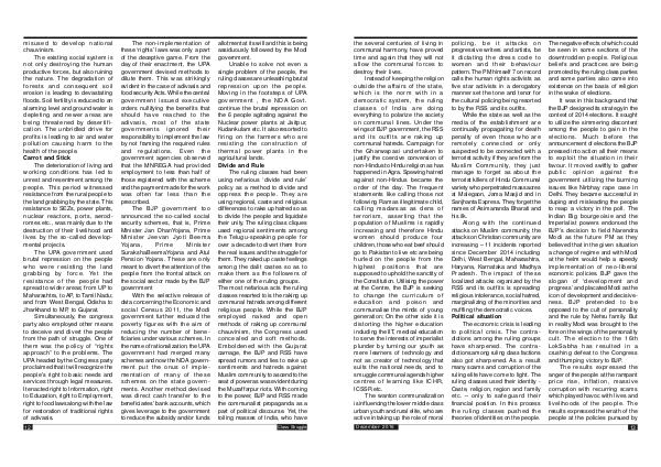 It was in this background that the BJP designed its strategy in the context of 2014 elections. It sought to utilize the simmering discontent among the people to gain in the elections. Much before the announcement of elections the BJP pressed into action all their means to exploit the situation in their favour. It moved swiftly to gather public opinion against the government utilizing the burning issues like Nirbhay rape case in Delhi. They became successful in duping and misleading the people to reap a victory in the poll. The Indian Big bourgeoisie and the Imperialist powers endorsed the BJP’ s decision to field Narendra Modi as the future PM as they believed that in the given situation a change of regime and with Modi at the helm would help a speedy imp lementation of neo-liberal economic policies. BJP gave the slog an of‘ development and progress’ and placated Modi as the icon of development and decisiveness. BJP pretended to be opposed to the cult of personality and the rule by Nehru family. But in reality Modi was brought to the fore on the wings of the personality cult. The election to the 16th LokSabha has resulted in a crushing defeat to the Congress and thumping victory to BJP.
