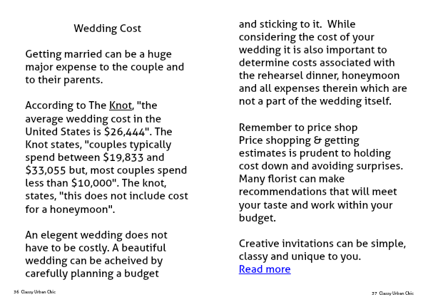 and sticking to it. While considering the cost of your wedding it is also important to determine costs associated with the rehearsel dinner, honeymoon and all expenses therein which are not a part of the wedding itself.