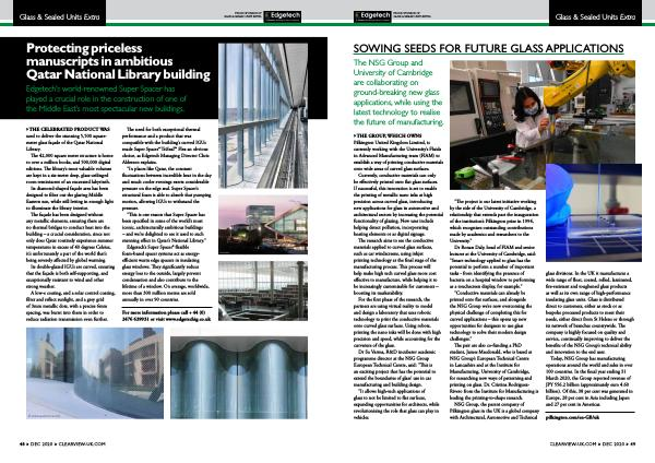 glass divisions . In the UK it manufactures a wide range of float , coated , rolled , laminated , fire-resistant and toughened glass products as well as its own range of high-performance insulating glass units . Glass is distributed direct to customers , either as stock or as bespoke processed products to meet their needs , either direct from St Helens or through its network of branches countrywide . The company is highly focused on quality and service , continually improving to deliver the benefits of the NSG Group ’ s technical ability and innovation to the end user .