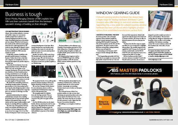 » NO MATTER WHAT THE ECONOMIC climate , there are always setbacks to overcome and hurdles to jump over . Last summer , installers emerged from Lockdown 1 to customers banging down their doors with orders . Everything looked rosy in the window and door industry . Wind the clock forward a few months and the well-documented supply issues have put a rather large spanner in the works for many , although I ’ m pleased to report that as I write these words in early September hardware availability for VBH customers remains very good .