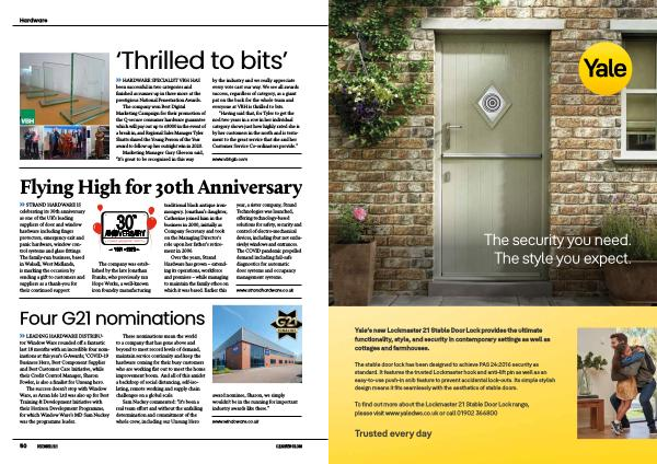 » STRAND HARDWARE IS celebrating its 30th anniversary as one of the UK ’ s leading suppliers of door and window hardware including finger protectors , emergency exit and panic hardware , window control systems and glass fittings . The family-run business , based in Walsall , West Midlands , is marking the occasion by sending a gift to customers and suppliers as a thank-you for their continued support . |