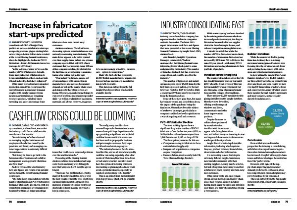 » ANDREW SCOTT , INDUSTRY consultant and CEO of Insight Data , predicts an increase in fabricator start-ups as capacity problems plague existing fabricators . His prediction follows data revealed at the recent Glazing Summit conference , where he highlighted a decline in PVC-U fabricators – from 1,860 manufacturers ten years ago to 1,195 today .